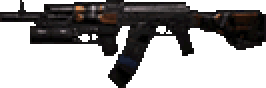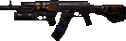 An AK-74 with the works; a GP-30 grenade launcher, a Holosight and hollow-point rounds. Its accuracy is good, especially with the sight, and it has a 30-round magazine.