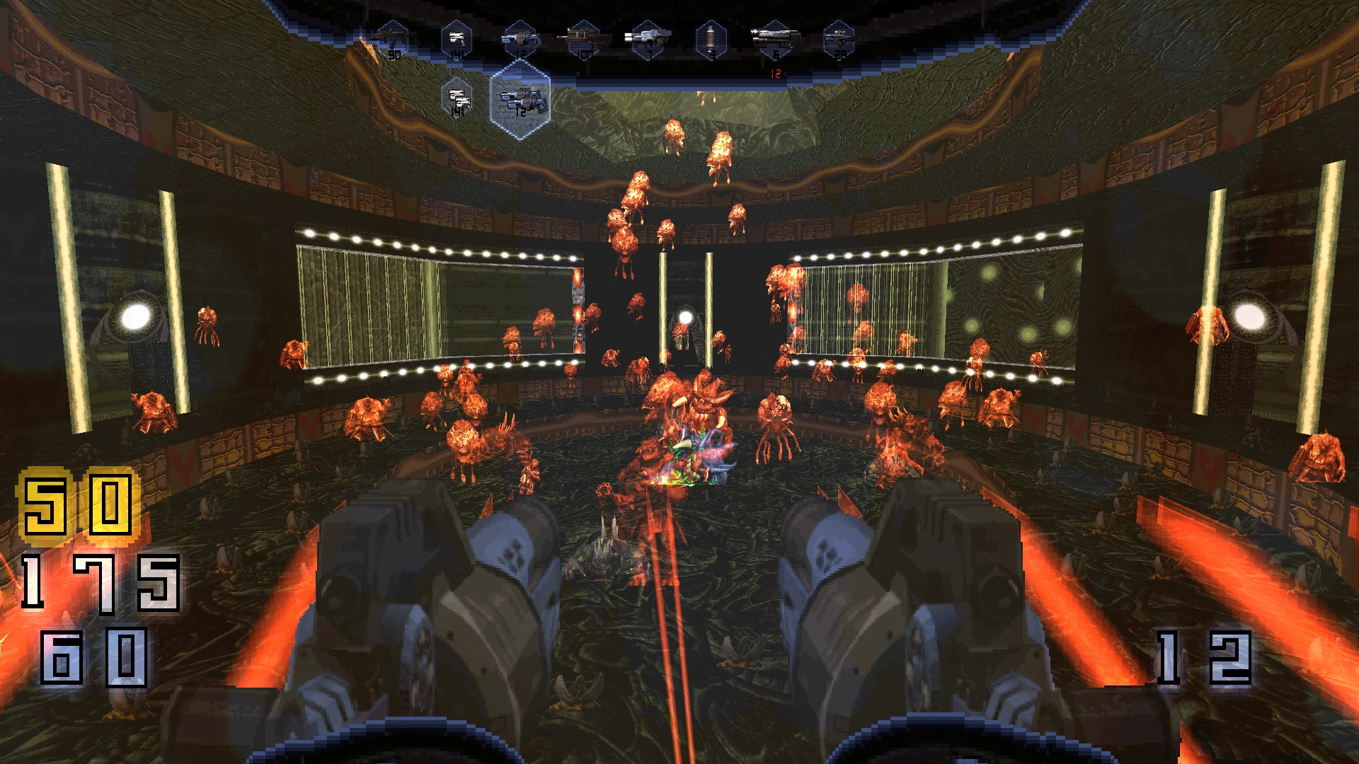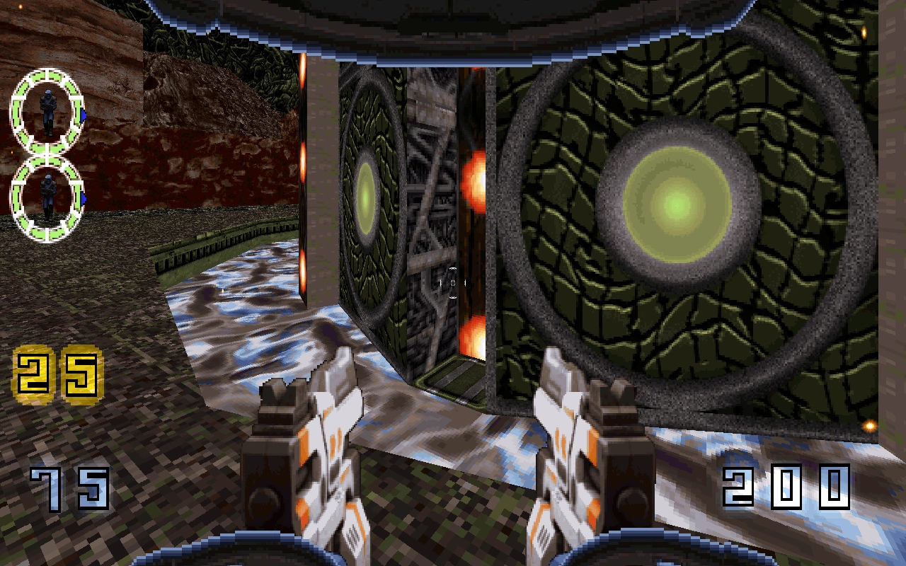 You can talk to and rescue the grey aliens in here. Go into the side, kill the Battlelord and use the fighter ship. Fly straight and land on the platform. Inside the red large room, head up to the control room and then drop onto the egg conveyor belt, then go inside and follow the tunnel to another big room. On the right is an armory if you want. Cross the bridge to the other side. You'll find a large room with lots of holograms. Go to the right semi opened door. Grab the blue rune key on the other side.