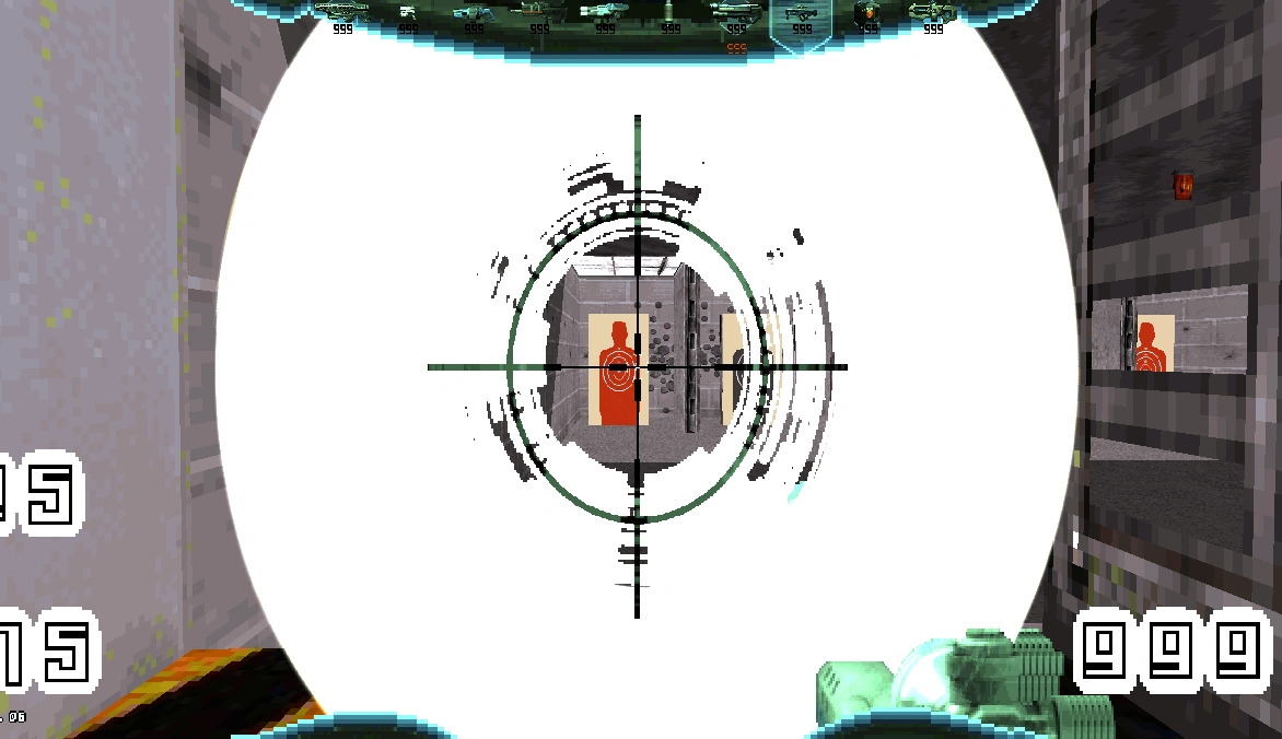 Currently, all zoom-functions are bugged. When standing adjacent to a sector boundary with the scope engaged causes the game to suffer a "Hall of mirrors" visual effect. This means the last frame isn't cleared, smearing the effects (see image).