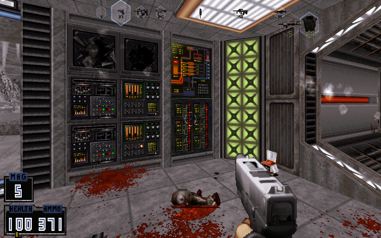 - After getting the key, press on the control panel on the right. There are 2 health powerups here. Then press on the wall inside this room to access the Rocket-Grenade Launcher and other supplies outside the window. Watch out for a Hadesphere that will spawn.