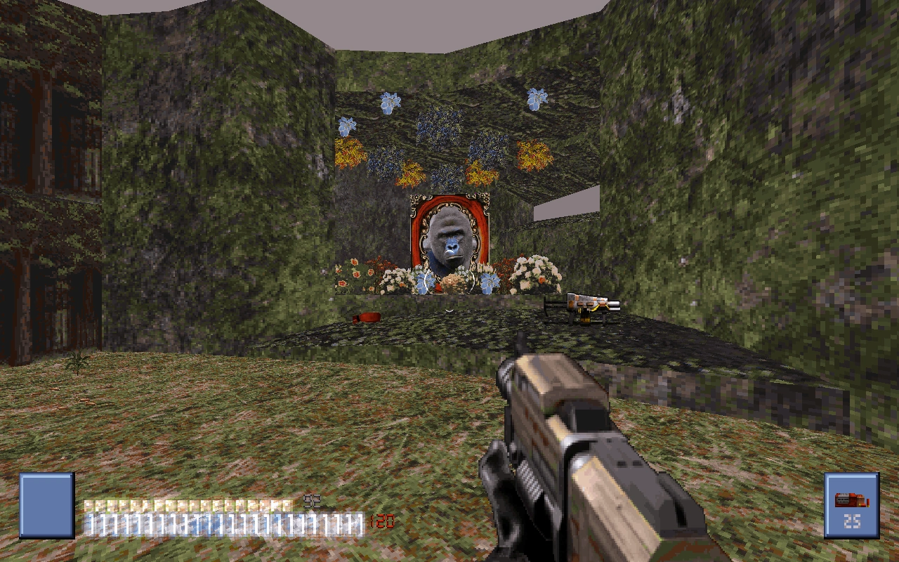 - When you find a railroad track, head right. You'll need a gas mask. There you'll find a shrine for a gorilla and a weapon.