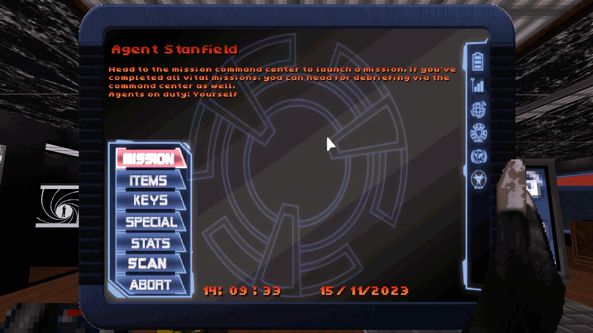 - Abort - allows you to abort the current mission and return to the AMC Base (for example, if you faced a heavy armoured or supernatural enemy and did not take a weapon with you that could harm it. Or if you encountered a game-breaking bug).