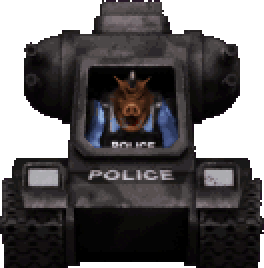 Being heavy armoured, the Pig Cop tank can be destroyed by armour piercing or electric weapons. When the tank is destroyed by the weapons, the Pig Cop inside will be blown up along with the tank he drives. There is also a self-destruct button on the back of the tank, which blows up the vehicle when pressed. However, the Pig Cop inside will always escape the tank when it self-destructs.