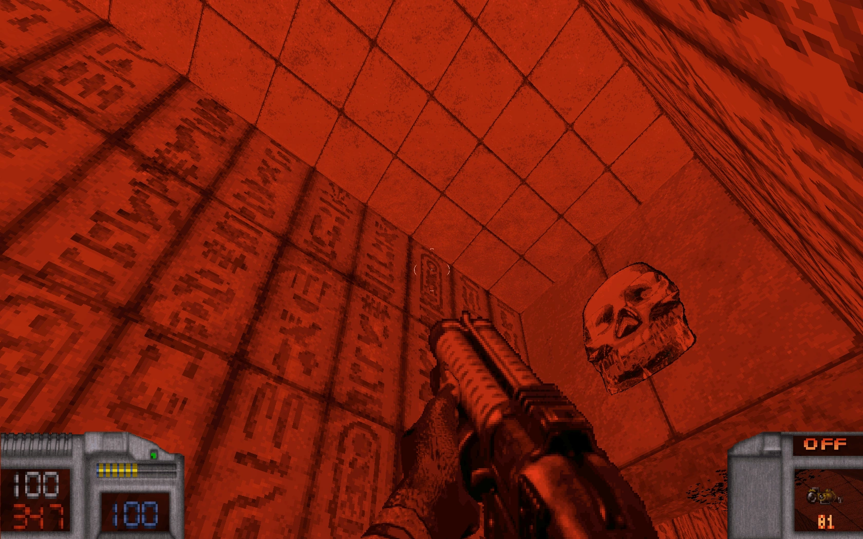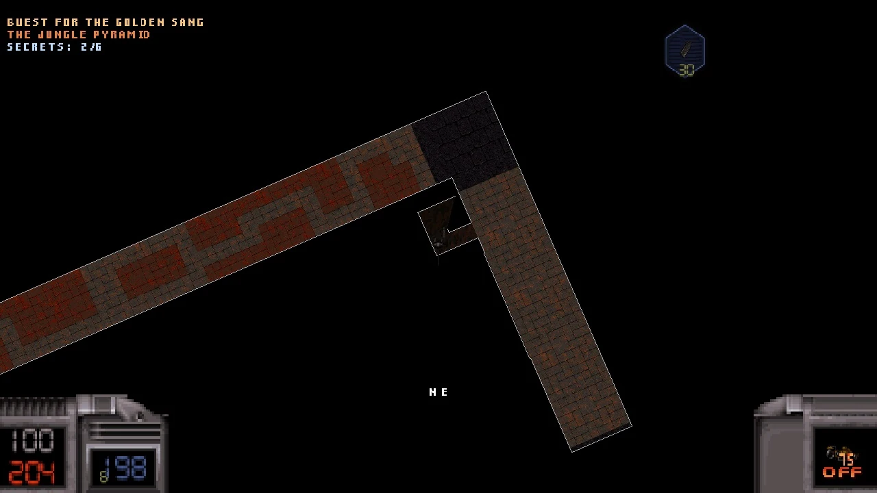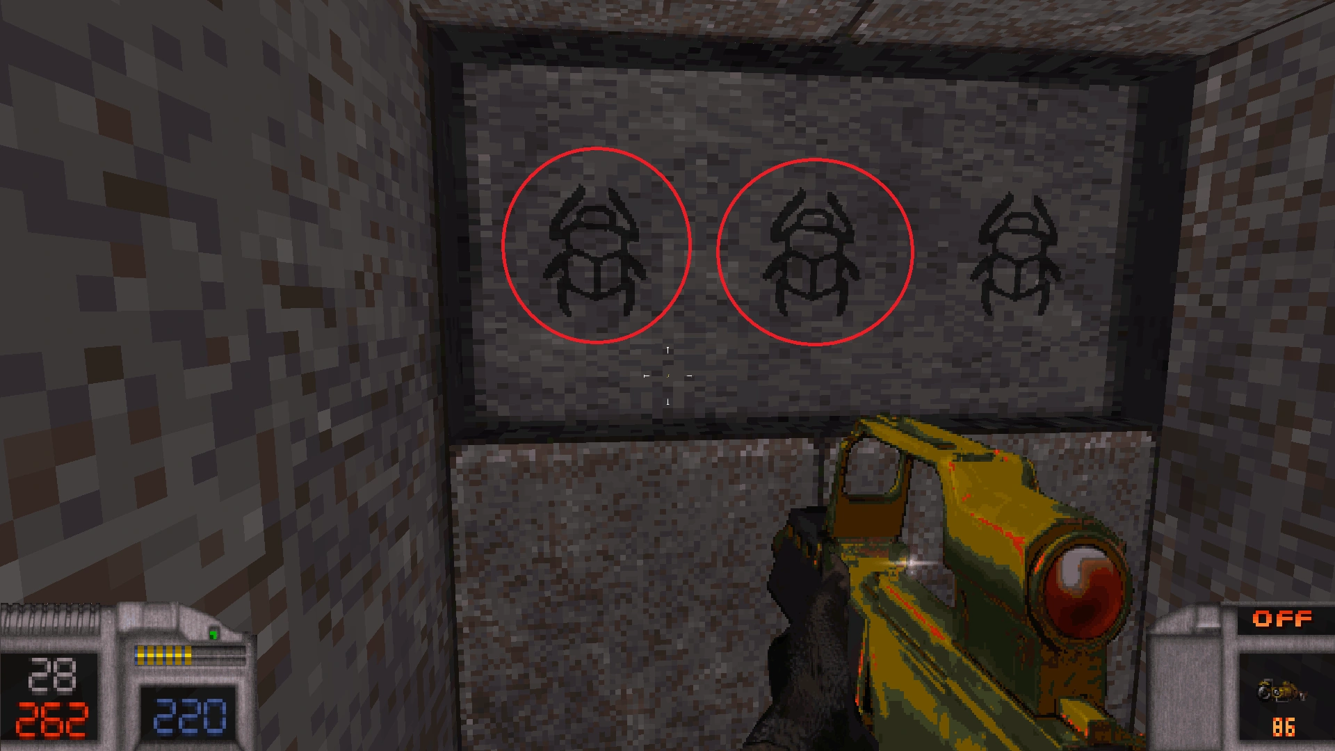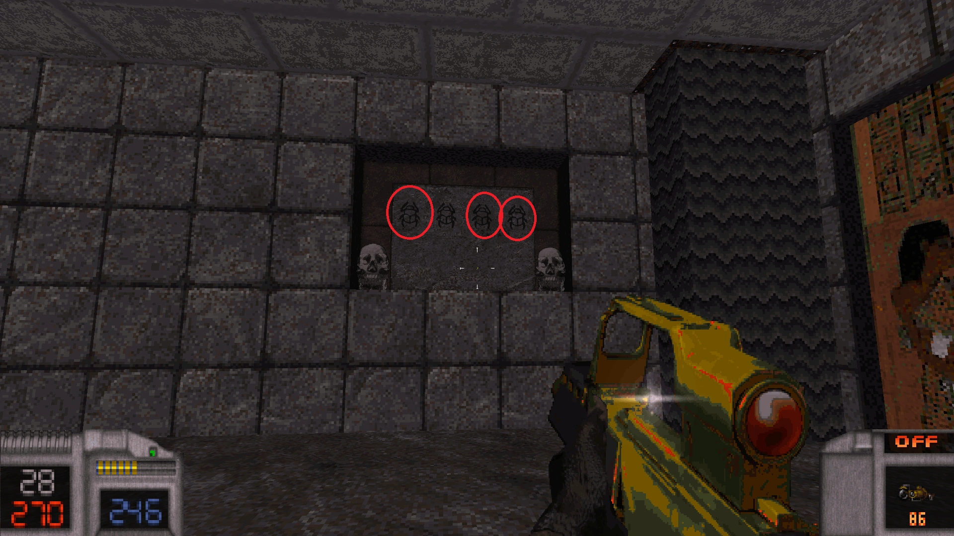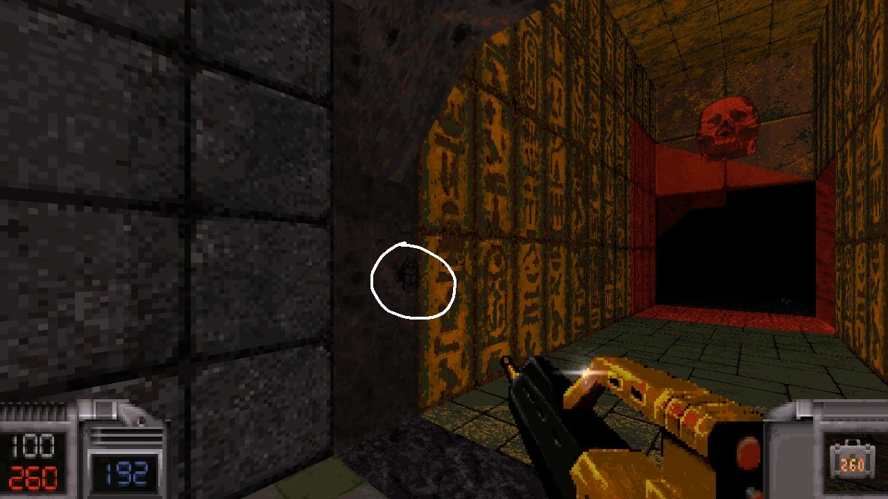 In each section there are some scarab buttons you have to find and press, which open Doom-like texture doors.