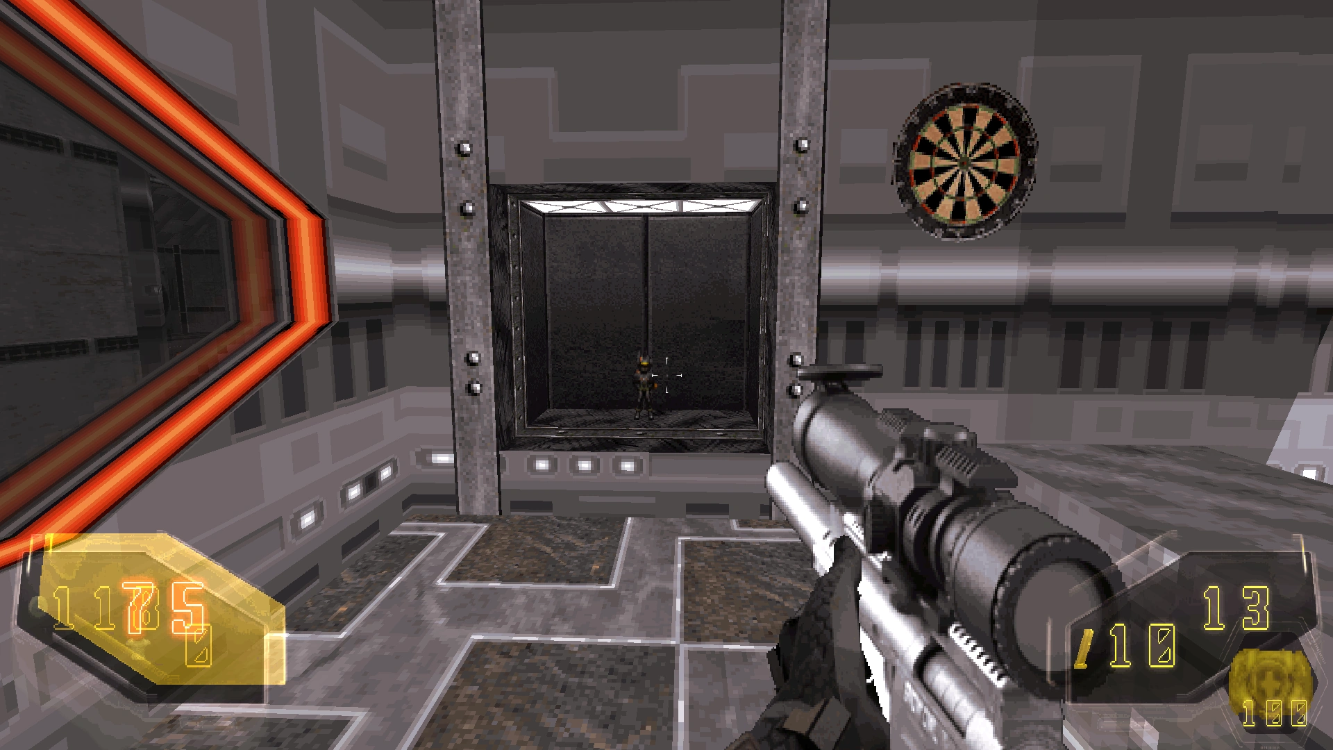 As Bombshell again, you are now in a heavily armed Juggernaut suit. Head towards the hangar and up an elevator. There will be a chopper at the top. Around there is the yellow keycard and a door. Use the key at the same place you pushed the switch earlier. Go back down to the hangar and go through the opened doors. Go down the elevator platform. Take off the suit here and jump out the window. Carefully move around the ledges to the next room. A door will open with some heavy MJ12 resistance. Try to avoid them and go grab the toolbox and go inside to hit the switch which opens the previous door. Put your Juggernaut suit back to to fight the MJ12. Continue through. When you reach a L shaped pathway, drop down and head to the lower section. Take off your suit and jump to the switch.
